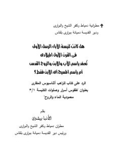Book Title: : The response to the book of baptism of the monk Athanasius Macari The author: ANBA. BISHOY BISHOP DAMIETTA AND PRAIRIE Number of pages: 28 |