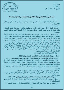وصف "تناول المرأة الحائض أو الوالدة من الأسرار المقدسة – مذكرة تمهيدية، للأنبا أغاثون أسقف مغاغة والعدوة ورئيس رابطة خريجي الكلية الإكليريكية"