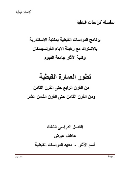 اسم الكتاب: تطور العمارة القبطية من القرن 4-8 م المؤلف: المهندس عاطف عوض عدد صفحات الكتاب: 105 |